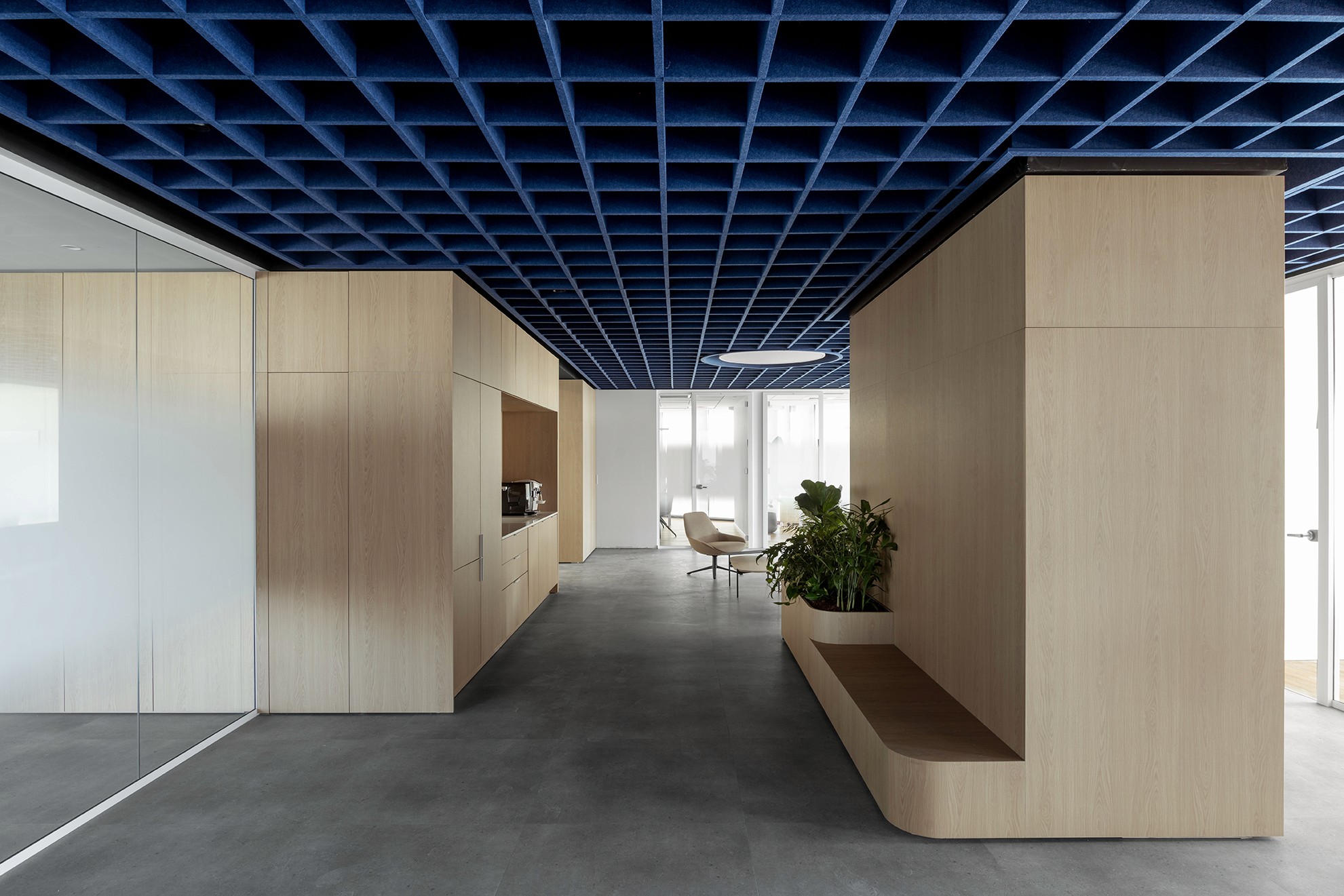 The BlueGen Headquarters was designed as a boutique, representative workspace exuding quiet elegance. The design features a unique blue acoustic grid ceiling floating above a central light wood core. The interplay of soft materials, glass transparency, and sea views creates an exclusive and precise atmosphere befitting a corporate HQ.